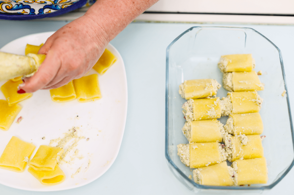 Cuocere molto al dente i paccheri, scolarli e riempirli con il composto preparato. Disporli in una pirofila imburrata versare sopra un po' di pesto e di besciamella spalmandoli e spolverare con parmigiano grattugiato.