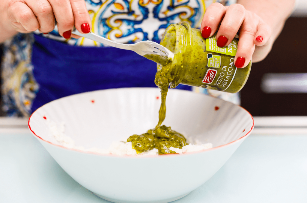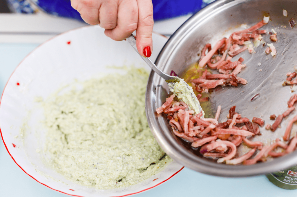 aggiungere il pesto, lo speck, il parmigiano, due cucchiai di besciamella e amalgamare bene.
