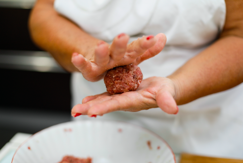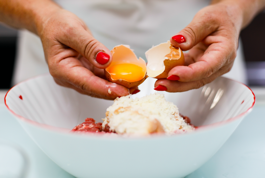Fare l' impasto per polpette con la carne, il pane, il formaggio e le uova.