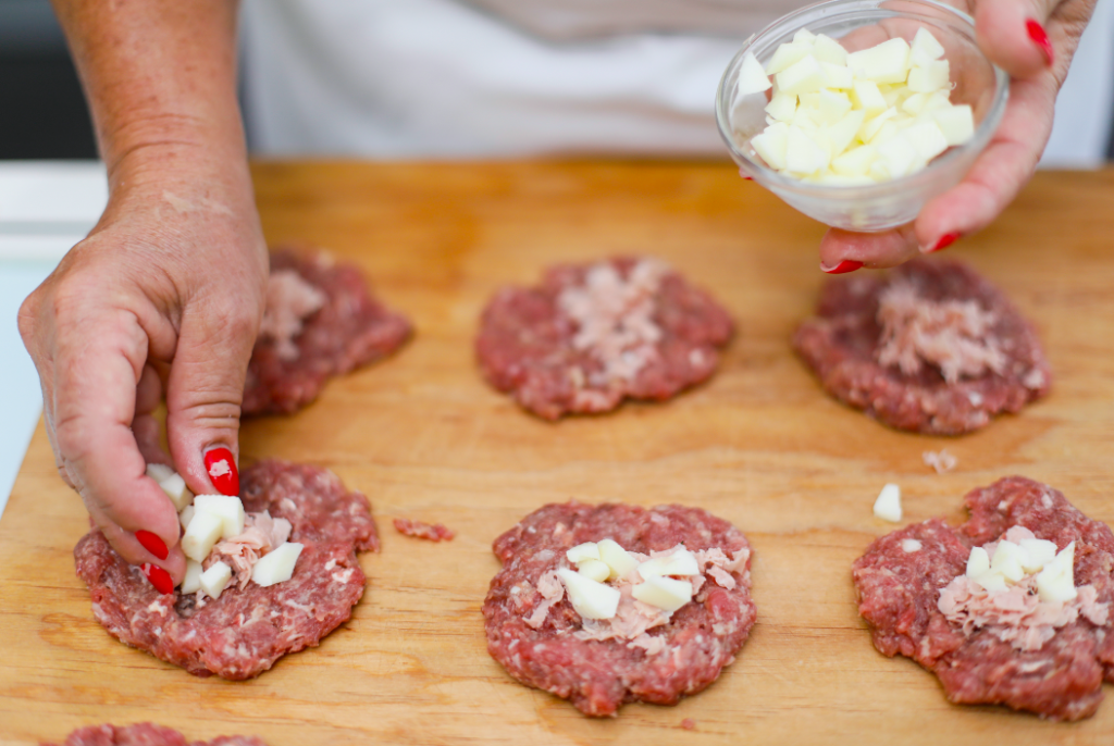 Mettere al centro su ognuna la mortadella e la provola finemente tritate.