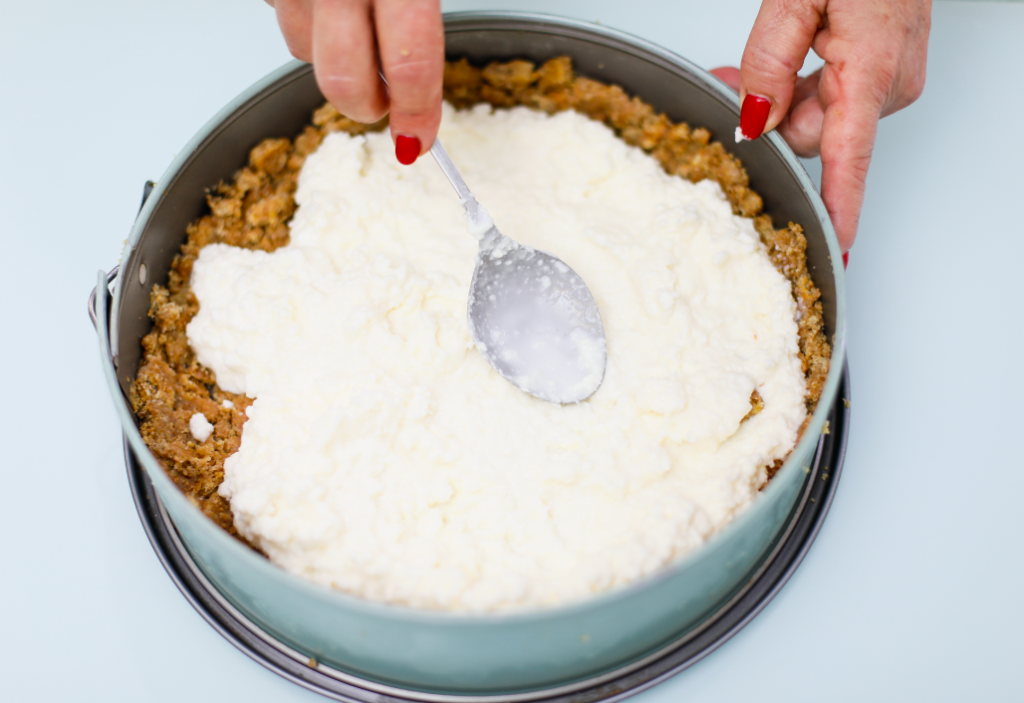 Tritare grossolanamente con le mani i biscotti e metterli in una ciotola, fate sciogliere il burro al microonde o a bagnomaria e versatela sui biscotti. Mescolate con un cucchiaio e versate più della metà dell'impasto nella tortiera. Con un cucchiaio compattare il fondo e ed alzate i bordi per contenere il ripieno. Mettete la base in frigo per 20 minuti.