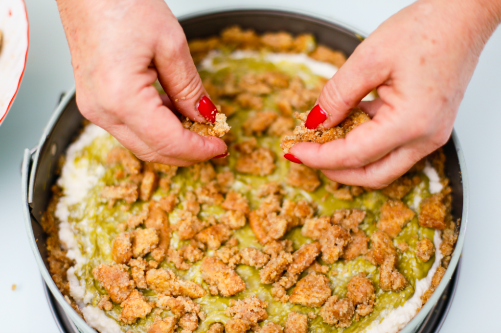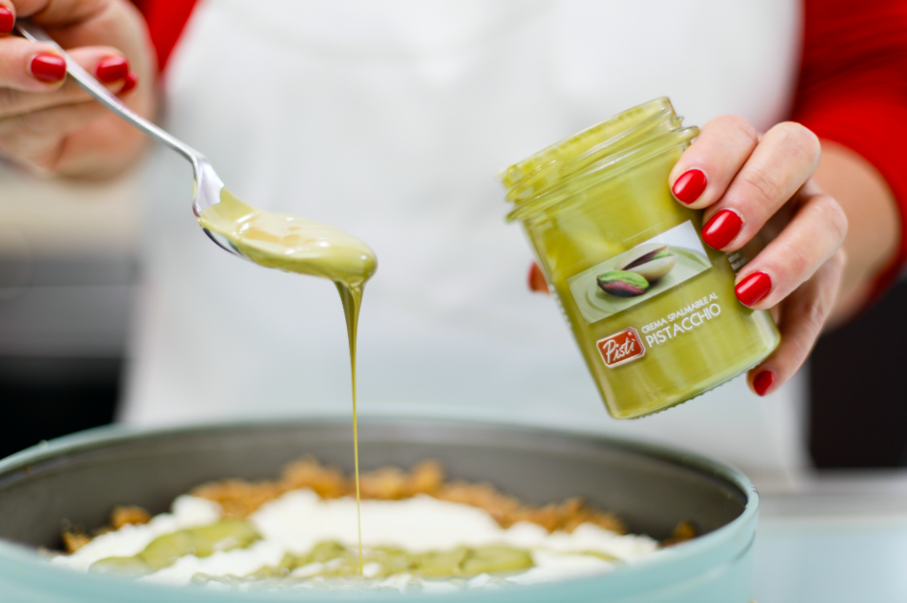 Ricoprite il ripieno con i restanti biscotti sbriciolati e completate la superficie con della crema di Pistazie.