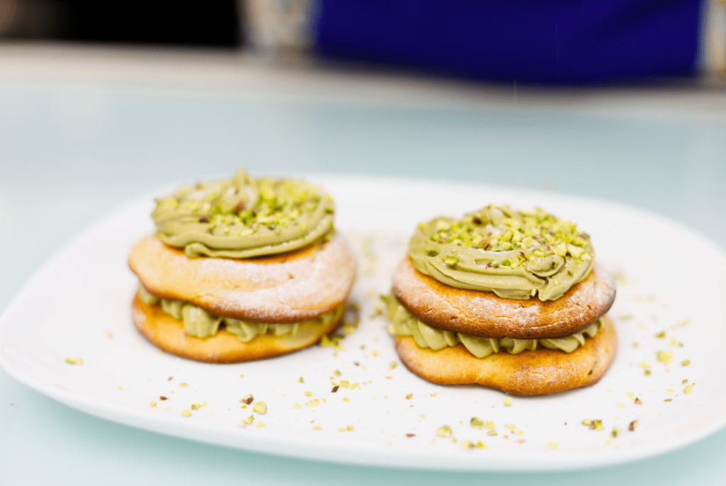 Montare la panna con 2 cucchiai di zucchero a velo, quindi aggiungere il mascarpone ed infine la crema di Pistazie l. Inserire tutto in una sac à poche e farcire le zeppole tagliate a metà, quindi spolverare con zucchero a velo e decorare.