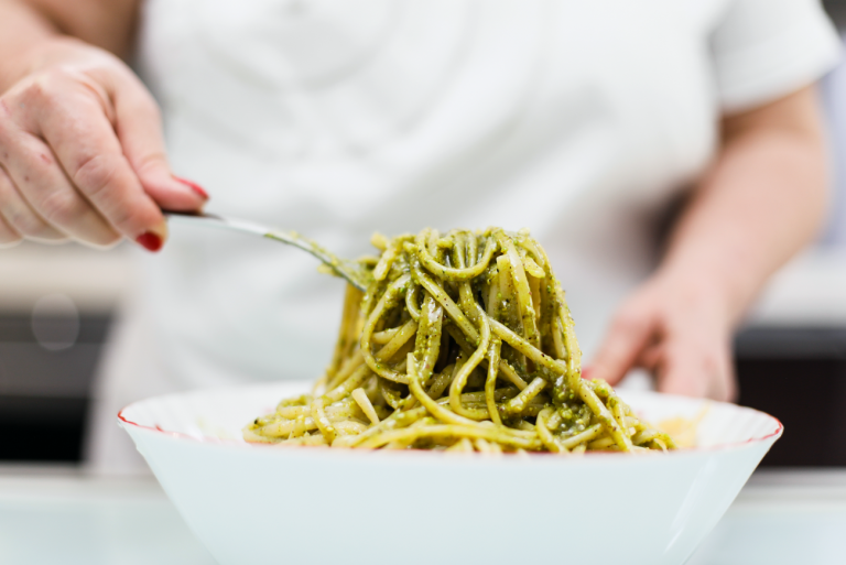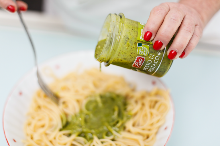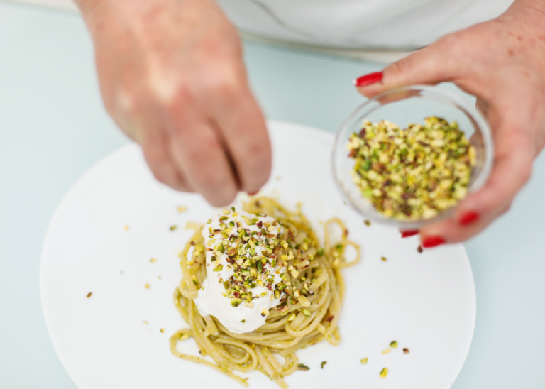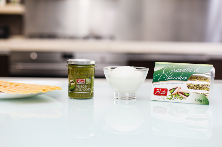 Prepariamo gli ingredienti per la preparazione delle linguine con pesto di pistacchio.