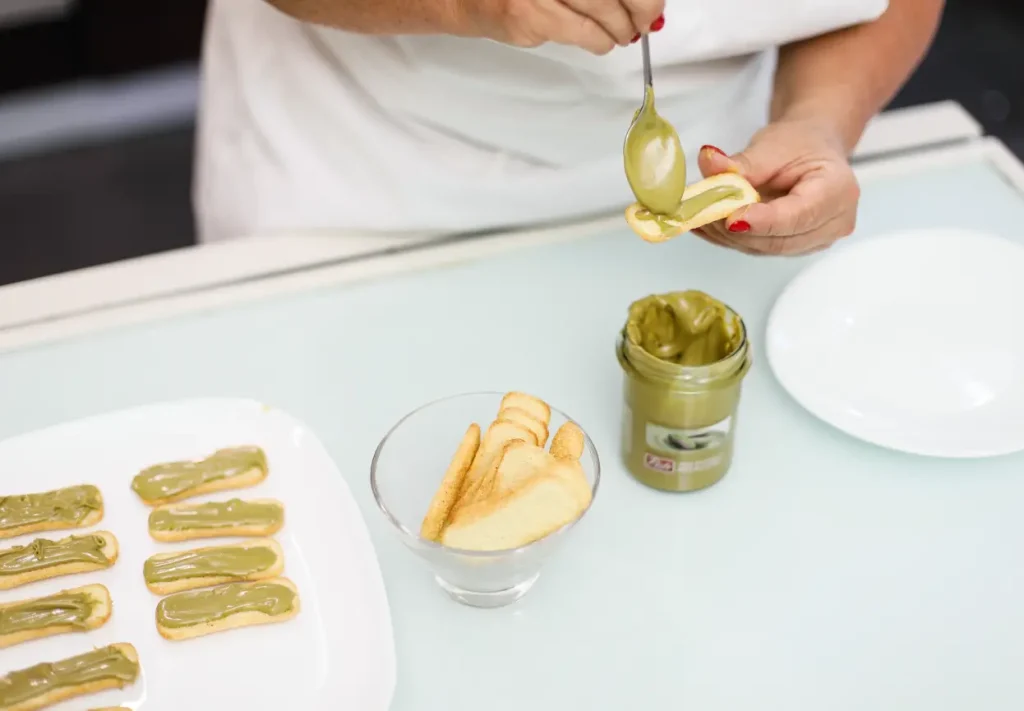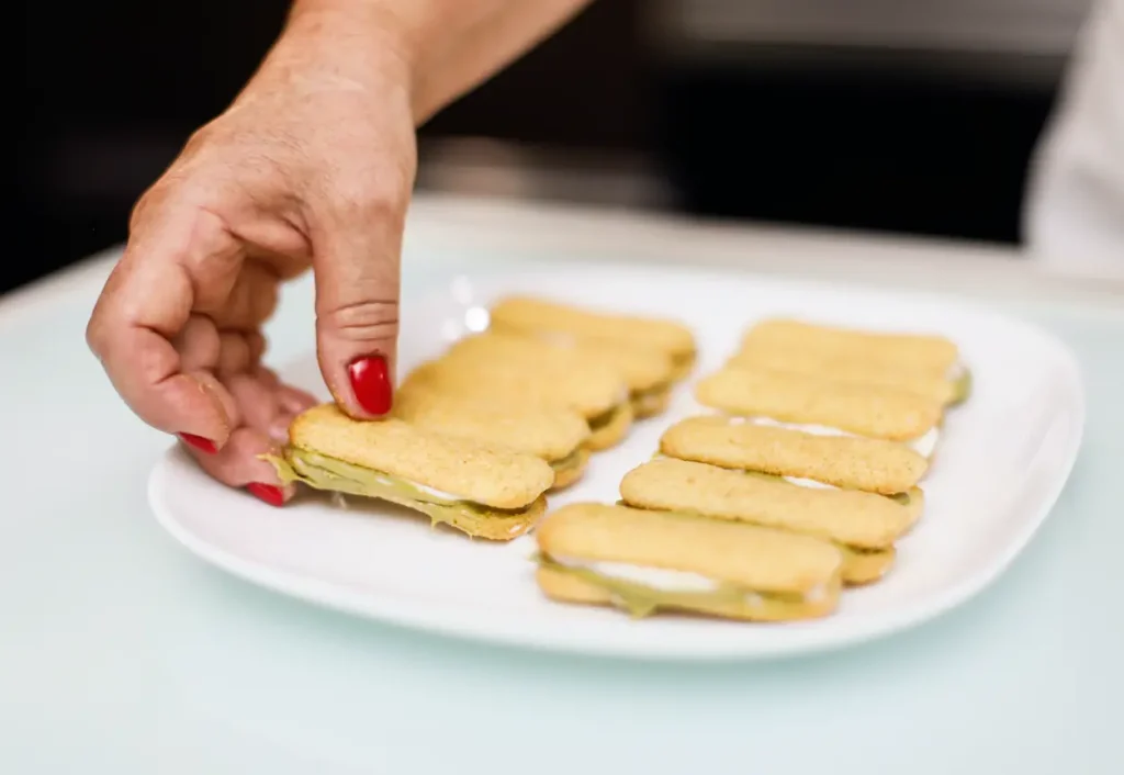 Disporre i pavesini su un piano, spalmare la metà di essi con la crema di pistacho e coprirli con uno strato di mascarpone.