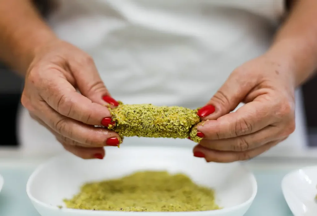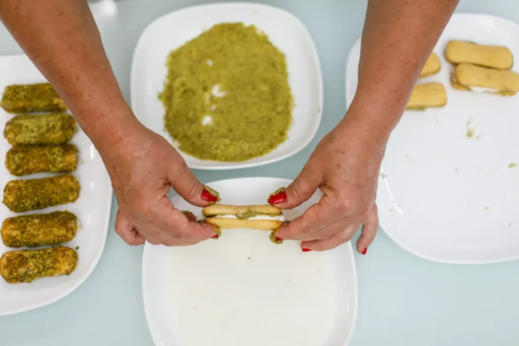 Intingere rapidamente i pavesini nel latte, uno per volta, quindi passarli nella farina di pistacho.