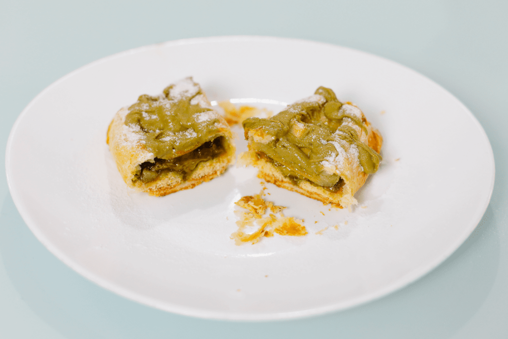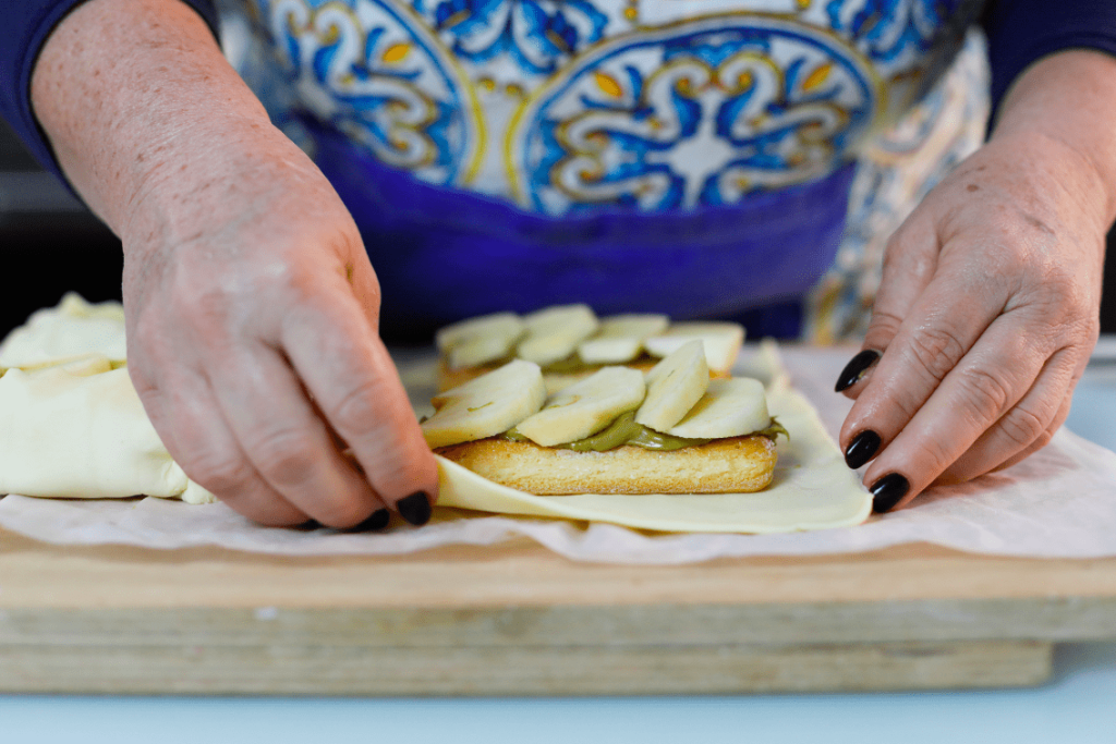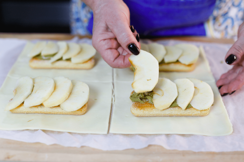 Disporre sopra un cucchiaino abbondante di crema di pistacchi e ricoprire con gli spicchi di mela.