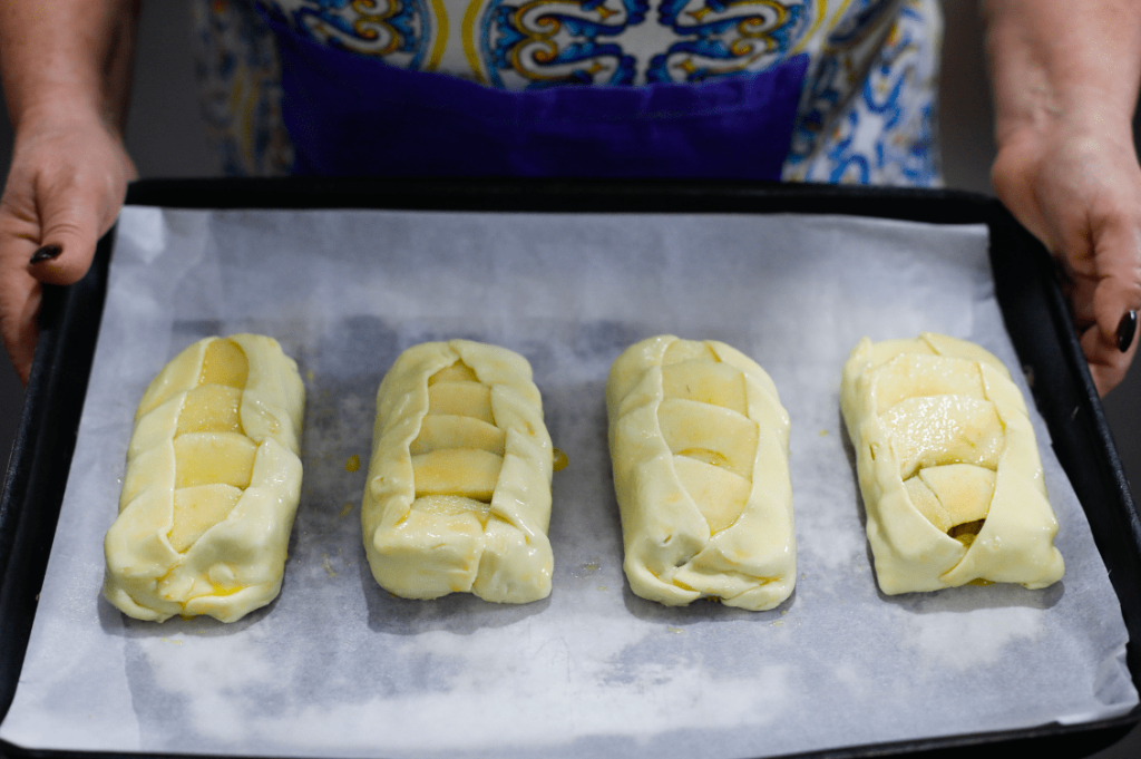 Chiudere i fagottini come da video, spennellarli con un uovo sbattuto con un cucchiaio di zucchero.