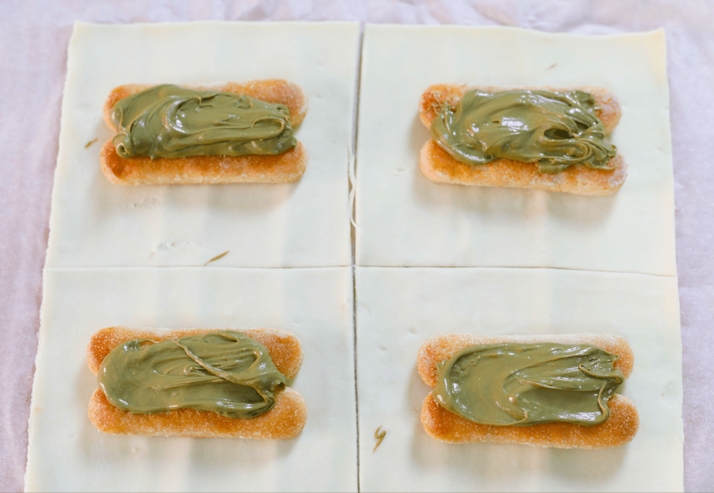 Tagliare la pasta sfoglia in 4 parti uguali. Disporre per ogni rettangolino due savoiardi e spennellarli con la bagna preparata precedentemente con l'acqua e un cucchiaio di zucchero.